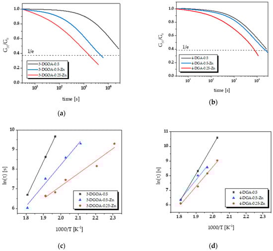The thermally triggered topology rearrangements of the networks were studied using stress relaxation experiments. Since the epoxy-anhydride vitrimers under investigation comprised a Tg in the range between 113 and 140 °C and were stable at least up to 280 °C, the stress relaxation experiments were carried out between 160 and 280 °C. Consequently, thermal degradation of the networks was avoided during the rheological measurements, whilst a high mobility of the chain segments was ensured as the studies were carried out above the networks’ Tg. In Figure 5a,b, the evolution of the relaxation modulus at 220 °C as a function of time is shown for 3-DGOA and 4-DGA networks, respectively. All networks comprise a distinctive stress relaxation, even networks without Zn(acac)2−H2O, albeit at a lower relaxation rate. Thus, the results clearly show that the tertiary amines of the epoxy monomers are able to catalyse the transesterification exchange reaction in the networks. As expected, the relaxation rate increases with the addition of Zn(acac)2−H2O giving rise to acceleration of the bond exchange reactions in the presence of the catalyst. In addition, networks prepared with r = 0.25 comprise a higher relaxation rate than the ones containing a lower excess of epoxy groups (r = 0.5). This is mainly attributed to the higher degree of epoxy homopolymerisation leading to a higher number of terminal –OH groups in the networks, which is well known to be advantageous for efficient stress relaxation [18]. In contrast, the limited availability of –OH groups leads to the lower relaxation rate observed in 4-DGA networks. FT-IR experiments have already showed that 4-DGA networks suffer from a lower content of –OH groups, which clearly affects the rate of bond exchange reactions at elevated temperature.