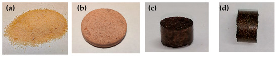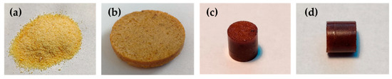 (a) Grinded powder from 4-DGA-0.5-Zn networks. (b) Remolded test specimen obtained by applying 5 bar at 220 °C. The diameter of the disc is 25 mm. (c,d) Remolded test specimen obtained by applying 500 bar at 250 °C. The diameter of the cylinder is 7 mm.