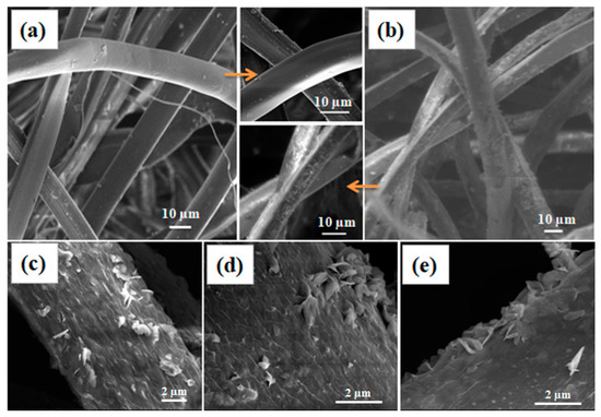 Degummed silk fibers with and without the treatment with zinc precursor are shown in Figure 1. While the degummed fibers show smooth morphology (Figure 1a); treated fibers exhibited a layer of particle deposition, due to formation of ZnO nanoparticles throughout the silk fibers surface (Figure 1b). The close magnification of the silk fiber images reveals that the formed ZnO particles are mainly flake type structures with 500–700 nm in length and ~60 nm thicknesses (Figure 1c–e). The top and side views of the fibers show the thickness, orientation, and aggregation of the ZnO flake structures on the surface of silk fibers. At the images (Figure 1d,e), there were few pseudo spherical type structures (160–190 nm), along with ZnO flakes.