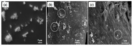SEM image of (a) ZnO particles devoid of silk fibers; (b,c) shows ZnO nanoflakes on silk fiber (ZnSk) structures and the aggregations of small particles; dotted circular regions in white display aggregations of pseudo smaller spherical particles.