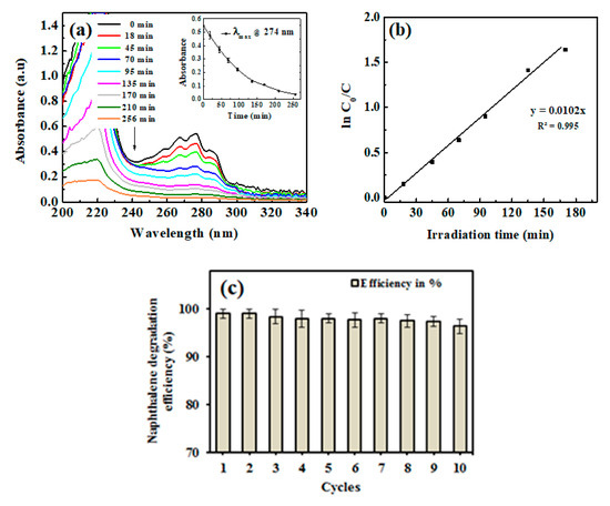 Next, we studied degradation study, where Figure 4a shows the kinetics of the photocatalytic degradation of naphthalene solution by the ZnSk composites. The time dependent spectral behavior of naphthalene at absorption maximum (λmax) of 274 nm is observed, with a decreasing trend in λmax values and up to 93% degradation is observed in 256 min. Silk fibers devoid of ZnO did not displayed any change in λmax value at 274 nm upon UV irradiation, indicating no effect on naphthalene degradation. The prepared ZnSk composites, after repeated use (three times), displayed a decreasing trend of naphthalene absorbance, and the average λmax values at 274 nm with increasing time is shown in Figure 4a inset.