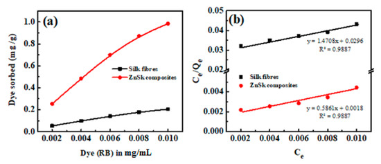 The adsorption kinetics was estimated using Equations (1) and (2) to get information on the adsorption behavior with respect to time. Batch adsorption data using the pseudo-first and second-order kinetic models are presented in Figure 5c,d for ZnSk and silk fibers individually. Correlation coefficient (R2) values for the pseudo-first order kinetics are 0.86 and 0.75 for ZnSk and silk fibers respectively, while R2 values for the second-order model are 0.99 and 0.99 for the same. A better correlation between the modelled and experimental data was observed using the pseudo-second order kinetics model. This favors chemisorption, and this behavior is the rate controlling factor for the adsorption of RB onto silk fibers and ZnSk composite used. The observed performance might be true, as the degummed silk fibers have the ability to fix anionic dyes through ionic bonding. Here, positive –NH2 group of the fiber will bind to acid group of dye [35].