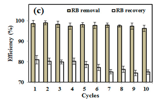 Using silk fibers and ZnSk composites, (a) RB adsorption vs. concentration and (b) linear plots showing the Langmuir adsorption isotherm parameters. (c) RB removal and recovery studies using ZnSk composites. Error bars are calculated standard deviation for three measurements.