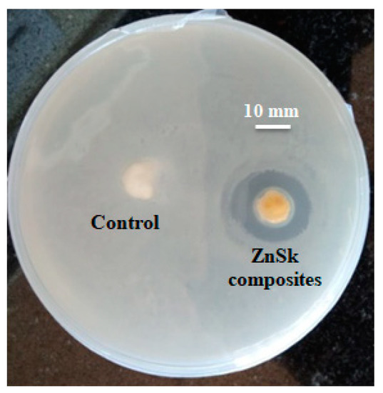 The antimicrobial activity of as synthesized ZnSk composite was tested on E. coli, and the results are presented in Figure 7. ZOI results showed significant antimicrobial property by ZnSk composite, with the observed inhibition zone of 1.2 ± 0.1 mm, and silk fibers used as control are insensitive to tested E. coli. ZOI at ambient room temperature and at normal day light condition suggests that ZnSk composite have promising antimicrobial action. There are various mechanisms of antimicrobial activity of nanoscale ZnO are reported by research groups and key factors of toxicity include size, shape, reactive oxygen species (ROS) production, hydrogen peroxide generation, attachment to bacterial cell surfaces, etc. [1,38,39,40]. Coming to ZnSk composite in this study, ZnO nanoflakes are deposited steadily onto the silk fibers, and the most possible mechanism of toxicity may be due to generation of ROS. The release of ROS by ZnO nanoparticles will result in cause of oxidative stress, DNA damage, decomposition of the cell wall, membrane leakage of reducing sugars, proteins, etc. [38,40], which are identified reportedly.