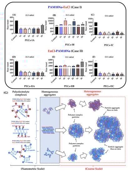 Characterization of particle size for ampicillin-loaded PECs. (A) PAM-18Na-EuCl 1:3 ratio. (B) PAM-18Na-EuCl 1:1 ratio. (C) PAM-18Na-EuCl 3:1 ratio. (D) EuCl-PAM-18Na 1:3 ratio. (E) EuCl-PAM-18Na 1:1 ratio. (F) EuCl-PAM-18Na 3:1 ratio. (G) scheme of the polyelectrolytic aggregates formation process in different size scales. The control corresponds to polyelectrolyte complexes obtained initially by polyelectrolytic complexation (bottom-up method) and was not subjected to UHPH (top-down method). “+” significant at p < 0.05.