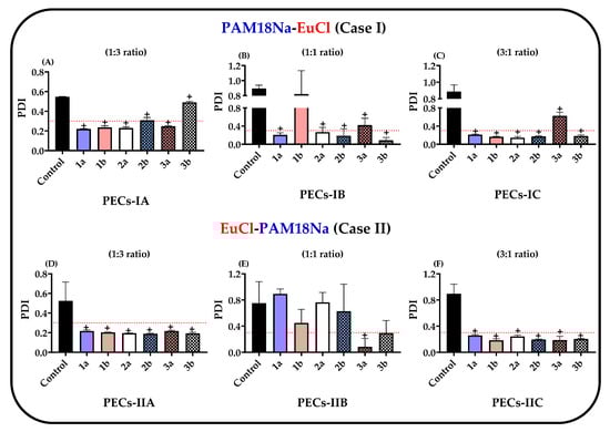 Characterization of the polydispersity index (PDI) for ampicillin-loaded PECs. (A) PAM-18Na-EuCl 1:3 ratio. (B) PAM-18Na-EuCl 1:1 ratio. (C) PAM-18Na-EuCl 3:1 ratio. (D) EuCl-PAM-18Na 1:3 ratio. (E) EuCl-PAM-18Na 1:1 ratio. (F) EuCl-PAM-18Na 3:1 ratio. The control corresponds to polyelectrolyte complexes obtained initially by polyelectrolytic complexation (bottom-up method) and was not subjected to UHPH (top-down method). “+” significant at p < 0.05.