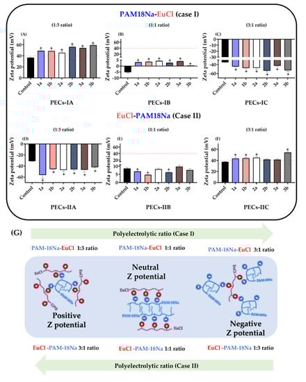 Characterization of zeta potential for ampicillin-loaded PECs. (A) PAM-18Na-EuCl 1:3 ratio. (B) PAM-18Na-EuCl 1:1 ratio. (C) PAM-18Na-EuCl 3:1 ratio. (D) EuCl-PAM-18Na 1:3 ratio. (E) EuCl-PAM-18Na 1:1 ratio. (F) EuCl-PAM-18Na 3:1 ratio. (G) Scheme of the formation of the PECs interfaces with different electrical polarization degrees. The control corresponds to polyelectrolyte complexes obtained initially by polyelectrolytic complexation (bottom-up method) and was not subjected to UHPH (top-down method). “+” significant at p < 0.05.