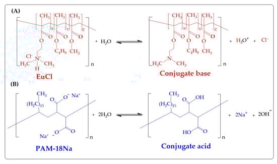 Chemical structure of the (A) PAM-18Na and (B) EuCl polyelectrolyte monomer units, as well as their ionization process in the aqueous medium.