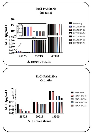Antimicrobial activity assays for PECNs showed different behaviors depending on the family of the complex (Figure 7). Thus, no significant antimicrobial effect was appreciated in the case of the EuCl-PAM18Na (1:3 ratio) family, which was mainly composed of the anionic PAM18Na, since the MIC was very similar to that obtained with free ampicillin. Besides, a slight decrease in MIC with the ATCC 25923 strain (ampicillin sensitive) was observed in most of the PECNs (except for PECN-IIA-1b and 1b). However, this change was not important because this is a sensitive strain. In the case of the ATCC 29213 strain (resistant to ampicillin; sensitive to oxacillin), any change in MIC was observed with respect to free ampicillin and remained around 1 µg/mL. A similar result was observed with the ATCC43300 strain (resistant to methicillin), which has the highest resistance degree, and where the MIC remained invariable around 16 µg/mL, except with the PECN-IIA-1a complex, which presented a MIC of 8 µg/mL.