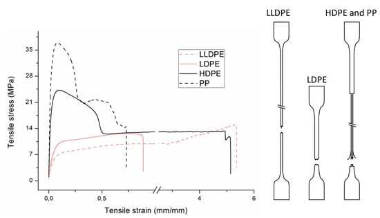 - Strapasson, R.; Amico, S.C.; Pereira, M.F.R.; Sydenstricker, T.H.D. Tensile and impact behavior of polypropylene/low density polyethylene blends. Polym. Test. 2005, 24, 468–473. [Google Scholar] [CrossRef]