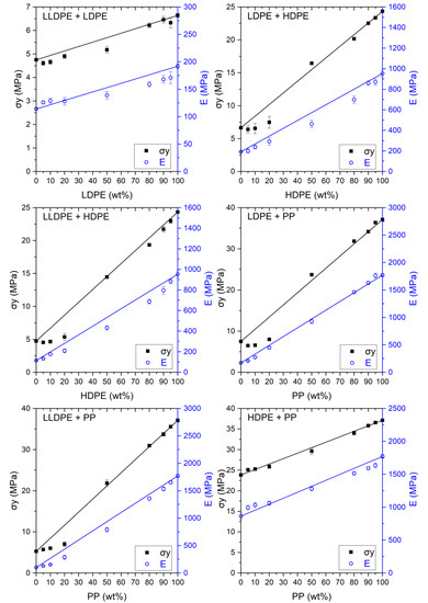 - Lovinger, A.J.; Williams, M.L. Tensile Properties and Morphology of Blends of Polyethylene and Polypropylene. J. Appl. Polym. Sci. 1980, 25, 1703–1713. [Google Scholar] [CrossRef]