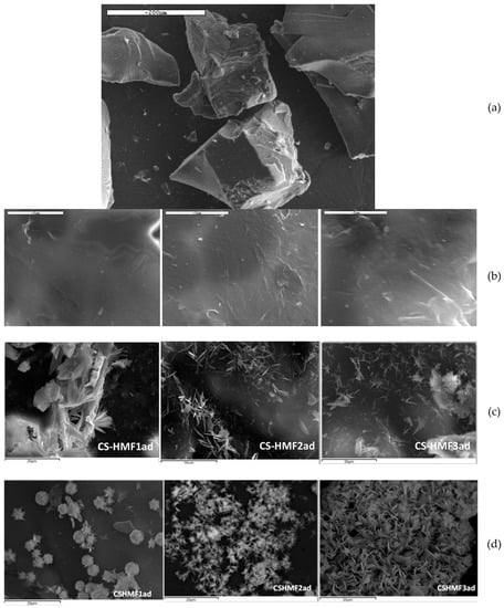 SEM images: (a) CS0; (b) CS-HMF derivatives before adsorption; (c) CS-HMF derivatives after Cu2+ adsorption; (d) CS-HMF derivatives after Cd2+ adsorption.