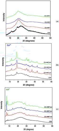 Figure 3 presents the XRD diffractograms of neat chitosan and chitosan derivatives prepared before, and after, metal ions adsorption. Neat chitosan displayed the classic semi-crystalline nature structure, which can be confirmed from the two broad peaks at 2θ = 11° and 20°, which clearly confirmed the polymer [] (Figure 3a). XRD patterns of the derivatives suggest complete amorphous structure; this can be verified by the one and only broad peak at ~20°. The grafting of HMF on chitosan caused the reduction of its folding ability, suggesting crystal structure formation. All patterns of metal-loaded CS-HMF showed amorphous structure. This is due to the adsorption mechanism, which is a combination of chelation and electrostastic interactions. The most interesting is that this was same in both copper and cadmium ion adsorption. Indicatively, the XRD patterns for the case of Cu2+-loaded derivatives are given in Figure 2b.