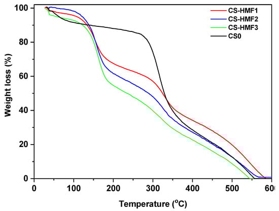 Figure 4 displays the TGA curves of the prepared chitosan derivatives. In the case of CS0, the first weight loss step (5%–8%) up to 120 °C is attributed to the loss of water. At temperature higher than 250 °C, the weight loss is about 40–45 wt % (this can be characterized as the major decomposition step). This corresponded to the decomposition of chitosan with reactions as dehydration of the saccharide rings and depolymerisation []. The thermal decomposition of derivatives presented similar behavior. There are four degradation steps. There is approximately 4% weight loss at 116 °C due to the loss of some water molecules (moisture). From 150 to 200 °C a second weight loss step is observed (37%) due to the removal of oxygen-based functional groups of the derivatives. The gradual weight loss at >250 °C is related to further degradation/removal of functional groups. The complete decomposition ends at 590 °C. Also, it can be stated that the increase in HMF grafting results in a decrease in thermal stability and increasing weight loss, compared to the neat chitosan. This is obvious from Figure 4, especially at temperature over 250 °C, where the difference of weight loss among the derivatives is about 5%–10%.