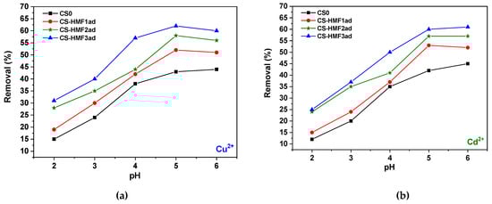 It is known that the effect of pH on adsorption plays important role on the success of the process. Figure 5 presents the pH-behavior of the process in the range of 2–6. As be observed for Figure 5, the trend of the pH-curves is the same for all derivatives both in Cu2+ and Cd2+ adsorption. The highest removal percentage was found at pH = 6 in all cases. Comparing the efficiency of the derivatives, CS-HMF3 material (310% grafting) showed the maximum removal over the whole pH-range. It is known that the metal ions adsorption majorly follows the bridge mode. This model suggest the binding of two (or more) amines from one chitosan chain with the metal cation (copper o cadmium in the present work) []. Other published studies suggest another model (pendant) by which the interaction takes place between one amine of chitosan (as pendant) and the cation []. It also important to mention that the majority of studies refer that the highest removal percentage in the case of Cu2+ and Cd2+ adsorption is in the range of 4–6 [,,].