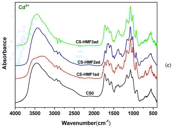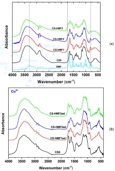 For the reasons explained above, the removal of ions is small at highly acidic conditions both for Cu2+ adsorption (CS0, 15%; CS-HMF1ad, 19%; CS-HMF2ad, 28%; CS-HMF3ad, 31%) and for Cd2+ adsorption (CS0, 12%; CS-HMF1ad, 15%; CS-HMF2ad, 24%; CS-HMF3ad, 25%). As the pH of solution increased, the deprotonation of the chitosan hydroxylic groups begin to deprotonate, therefore an electrostatic-like interaction may exist among Cu2+ or Cd2+ and deprotonated hydroxylic groups of chitosan. The latter can be also confirmed with FTIR spectroscopy as illustrated in Figure 6.