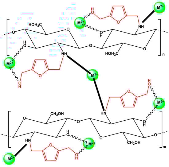 At low pH values (high acidic), two types of interactions might occur: (i) Electrostatic repulsion between positive metal ions and positively charged (protonated) amino groups of chitosan (those which have not reacted with cross−linker) (Equation (7)), and (ii) deposition/diffusion of metal ions onto chitosan network (Equation (8)):