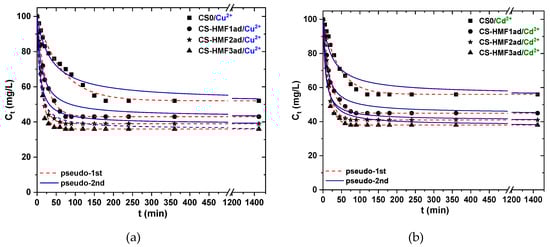 Kinetic data for the removal of (a) Cu2+ and (b) Cd2+ by CS0, CS-HMF1ad, CS-HMF2ad, CS-HMF3ad. Fitting to PS1 and PS2 equations. Experimental conditions: C0 = 100 mg/L, V = 20 mL, N = 160 rpm, T = 25 °C, ph = 5, m = 0.02 g.