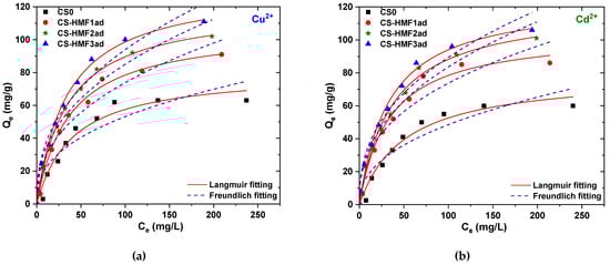 Equilibrium data (T = 25 °C) for the removal (a) Cu2+ and (b) Cd2+ by CS0, CS-HMF1ad, CS-HMF2ad, CS-HMF3ad. Fitting to Langmuir and Freundlich equations. Experimental conditions: C0 = 10–300 mg/L, V = 20 mL, N = 160 rpm, T = 25 °C, t = 200 min, pH = 5, m = 0.02 g.
