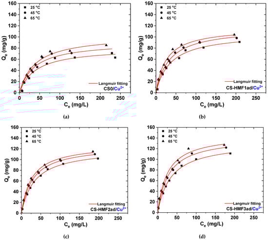 The temperature-effect was also studied for 45 and 65 °C. As it was found, the best fit was achieved with the Langmuir equation, and the equilibrium data for 45 and 65 °C were fitted only to Langmuir equation (Table 2). All derivatives presented the same behavior by increasing from T = 25 to 65 °C, an increase of the adsorption capacity (metal uptake) was observed. For Cu2+ adsorption (Figure 10), CS-HMF1ad enhanced its capacity from 107 mg/g at 25 °C to 117 mg/g at 45 °C, and finally 118 mg/g at 65 °C. CS-HMF2ad also demonstrated similar findings (from 120 mg/g at 25 °C to 126 mg/g at 45 °C, and finally 129 mg/g at 65 °C); CS-HMF3ad also improved its capacity by increasing the temperature (from 133 mg/g at 25 °C to 142 mg/g at 45 °C, and finally 147 mg/g at 65 °C). The above increase was approximately 9% for CS-HMF1ad, 7.5% for CS-HMF2ad and 11% for CS-HMF3ad.