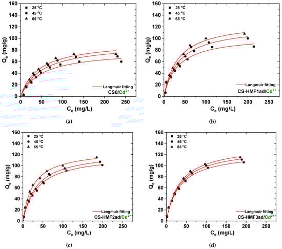 In the case of Cd2+ adsorption (Figure 11), CS-HMF1ad enhanced its Qm from 105 mg/g at 25 °C to 122 mg/g at 45 °C, and finally 130 mg/g at 65 °C. Similar adsorption behavior was revealed for CS-HMF2ad (from 119 mg/g at 25 °C to 126 mg/g at 45 °C, and finally 129 mg/g at 65 °C) and CS-HMF3ad (from 125 mg/g at 25 °C to 132 mg/g at 45 °C, and finally 138 mg/g at 65 °C). The above increase was approximately 24% for CS-HMF1ad, 8% for CS-HMF2ad and 10% for CS-HMF3ad.