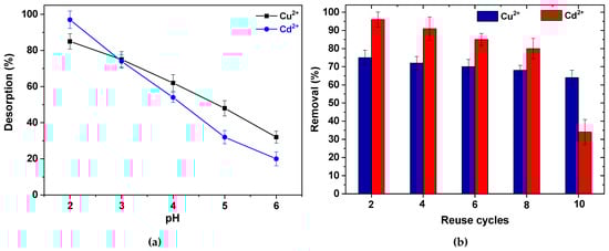 It is very important to determine the reuse potential of a prepared adsorbent. For this reason, before running reuse cycles, the optimum desorption conditions (eluant) must be found. It must be noted that the desorption and reuse experiments were carried out with only the best adsorbent (CS-HMF3) found after the evaluation achieved in previous section. In Figure 12a, the desorption percentage of CS-HMF3 is illustrated in both metal ions. It is noted that the highest desorption ability was found at pH = 2 (97% for cadmium and 86% for copper). This can be attributed to the the fact that the chelated bonds between metal ions and amino (or hydroxyl) groups of chitosan were weakened decreasing the pH of solution, so the desorption presented higher percentages at acidic pH values []. However, given the adsorption process is not considered to be fully reversible, incomplete desorption can be suspected for all pH values.