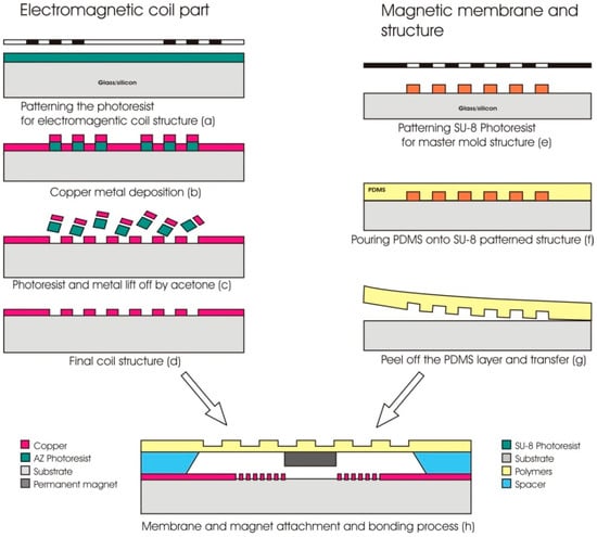 Some examples of soft lithography process in the fabrication of polymer-based MEMS structure were reported by Ghanbari et al. [] and Yunas et al. [,]. The microactuator part can be fabricated separately. Thus, the fabrication process can start with the electromagnetic part (1), followed by the fabrication of magneto-mechanic part (2) and finally with the bonding of both parts using epoxy (3). The detailed fabrication process of a micropump system is shown in Figure 2. The electromagnetic coil pattern is first created followed by the deposition of planar copper (Cu) microcoil wire (a) and (b). The coil structure is formed after the lift-off process (c) and (d). Next is the fabrication of the magneto-mechanical part that involves the patterning of mold master using SU8-based photolithography process (e). Then, the polymer membrane is fabricated by pouring the PDMS onto the pre-patterned structure (f) followed by peeling-off of the material (g) before transferring it onto a spacer surface. The final step of the process is the attachment of the permanent magnet onto the transferred membrane and all fabricated parts are bonded together using epoxy glue (h).