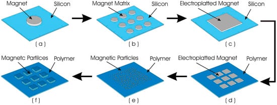 Development history of magnetic polymer composite-based MEMS actuator membranes, (a) silicon-based membrane with attached permanent magnet [], (b) silicon membrane with attached small permanent magnet in matrix form [], (c) silicon membrane with electroplated magnetic material [], (d) polymer membrane with electroplated magnetic material [,], (e) polymer membrane with embedded magnetic particles [], (f) polymer membrane with three-dimensional matrix structured embedded magnetic particles [].