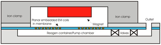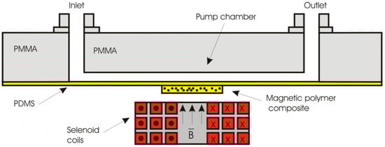Schematic of a valveless EM micropump involving PDMS and PMMA materials and utilizing magnetic composite membrane to replace the bulk permanent magnet.