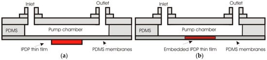 Schematic of iron particle dispersed PDMS (IPDP) for valveless micropumps, (a) stacked thin film design, (b) embedded thin film design.