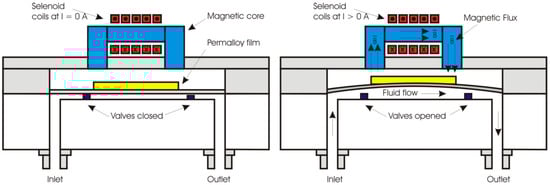 Electromagnetically actuation of flexible membrane incorporating microvalve for micropump application has been also reported by Sadler et al., as shown in Figure 8 (left) in a closed mode and (right) in an open mode []. The normally closed magnetic microvalve has both fluidic and electrical connections bonded to a glass motherboard. The microvalve comprised a magnetoactive membrane, a stationary valve seat and inlet/outlet channel. The magnetoactive membrane as a diaphragm plated with permalloy films on the top will interact with electromagnet flux generated by inductor to produce the magnetic force. A polymer film was attached to the system to ensure there is no leak. The force would lift up the membrane from the valve seat thus opened the valve and allowed the fluids to flow from inlet to outlet due to pressure difference.