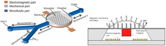 In general, the magnetic membrane actuation is achieved by the deformation of the movable membrane due to the generated magnetic force acting onto the membrane. The common structure of a magnetic actuator is schematically displayed in Figure 1a. The system consists of the magnetic field generator part (electromagnetic coil) and the magnetic membrane part (flexible membrane plus an attached magnet) [,].