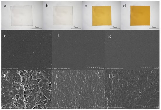 Optical photographs: (a) polycarbonate (PC), (b) C-0 (without crosslinking), (c) C-1 (crosslinked with only glutaraldehyde), (d) C-2 (crosslinked with EDC/NHS (1-ethyl-3-(3-dimethylaminopropyl) carbodiimide/N-hydroxysuccinimide) and glutaraldehyde); and scanning electron microscopy (SEM) images of surface: (e) C-0, (f) C-1, (g) C-2; and cross-section: (h) C-0, (i) C-1, (j) C-2.