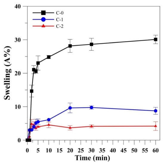 Figure 2 shows the swelling ratio measured at different time intervals for the C-0, C-1, and C-2 films. The swelling ratio for C-0 was increased drastically and reached saturation in 20 min with the swelling ratio of 28.15% and remained constant up to 60 min. Similarly, for C-1 the swelling ratio increased with time and attained 8.77% at 60 min, whereas for the dual-crosslinked gelatin film (C-2), the swelling ratio reached saturation in 5 min with the swelling ratio of 3.98% and remained constant up to 60 min, which is lower than C-0 and C-1. Gelation could adsorb water molecules as it is hydrophilic in nature. Upon incorporation of glutaraldehyde, the swelling property of the gelatin film was found to decrease possibly due to the increase in hydrophobicity of the matrix [42]. Another reason that could be attributed to this phenomenon was the increase in the crosslinking density between the glutaraldehyde and gelatin [43]. When glutaraldehyde was added to gelatin, the reaction between the amine (NH2) group of gelatin and the carbonyl (C=O) groups of glutaraldehyde would occur leading to the formation of a gelatin hydrogel network [27]. EDC/NHS crosslinking of gelatin film along with glutaraldehyde further reduced the swelling behavior of the gelatin film which could be possibly due to high crosslinking at longer duration (48 h). This is also possible from the production of short-range molecular crosslinks since reaction of EDC/NHS with gelatin matrices brought gelatin films more low-swelling structure [44]. In general, the degree of swelling was reduced for the polymer with high crosslinking and hence among all, the dual-crosslinked gelation film possessed a small rate of swelling indicating the low water adsorption capacity and increased hardness of the material [45].
