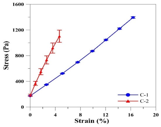 Stress–strain curves recorded from C-1 and C-2 gelatin films.