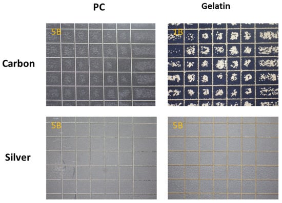 Optical microscopic images of adhesion test results for the screen-printed electrodes (SPes) on C-2 gelatin and PC substrates. Adhesion is assessed on a 0B to 5B scale, where 0B is the poorest and 5B is the best.