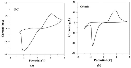 The fabricated silver SPEs on C-2 gelatin film were characterized by cyclic voltammetry (CV) in potassium ferricyanide solutions and their performances compared with silver SPEs on PC substrate. Analytical data obtained from CV studies are shown in Figure 5. The results showed that the cyclic voltammograms for Ag electrode on PC and C-2 gelatin film almost exhibited the same common features. There were two redox peaks in each curve, which could be attributed to the redox of ferric ions. The upward peak is an anodic peak, reflecting the oxidation process from ferrous ion to ferric ion. Correspondingly, the downward peak is a cathodic peak, reflecting the reduction process from ferric ion to ferrous ion [34]. The sigmoidal response and its degree of symmetry indicated the irreversible nature (between silver ink and potassium ferricyanide) of the electroactive substances. This CV response suggests that the SPEs on soft gelatin substrate are very suitable for obtaining electrical signals from biological cells.
