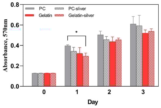 MTT assay was executed to test the cell viability on C-2 gelatin substrate. L929 fibroblast cells were cultured on PC film and C-2 gelatin film for three days both in the presence and absence of Ag-SPE and the biocompatibility test with MTT assay results are shown in Figure 6. The MTT assay results exhibited that the proliferation of L929 fibroblasts is insignificant on C-2 gelatin substrate and C-2 gelatin substrate with Ag-SPE. On the first day, the cells proliferated, and then the growth became stagnant for all groups, although PC film and Ag-SPE gelatin film showed significant difference (p < 0.05). This result clearly indicates that C-2 gelatin substrate and Ag-SPE are not cytotoxic toward cell proliferation. Thus, the C-2 gelatin film could provide a biocompatible surface with exposed ligands that promotes cell attachment and proliferation by integrin-mediated interactions [23].