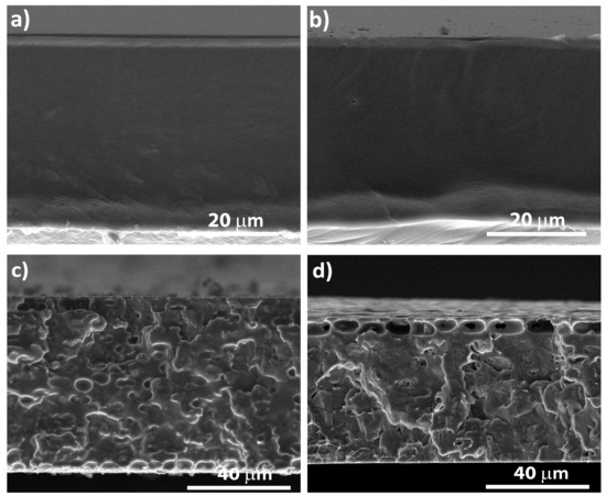 Cross-section SEM images of the PLLA-based films: (a) PLLA-DT25, (b) PLLA-DT50, (c) PLLA/[Emim][TFSI]-DT25 and (d) PLLA/[Emim][TFSI]-DT50.