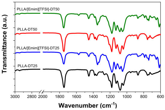 To evaluate possible chemical modifications occurring in the PLLA polymer structure depending on the film processing at different drying temperatures, and to determine the effect of blending PLLA with [Emim][TFSI], all samples were analyzed by ATR/FTIR spectroscopy. The ATR/FTIR spectra are reproduced in Figure 3. The assignment of the main vibration bands is given in Table 1.