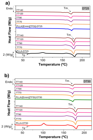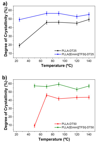 Likewise, the post-thermal treatments promoted an important increase in the degree of crystallinity of the samples (Table S1). In all cases, this increase was more marked for the post-thermal treatment performed at 70 °C: from 19% to 46% and from 49% to 56% in the case of PLLA-DT25 and PLLA/[Emim][TFSI]-DT25, respectively. For the samples dried at 50 °C (PLLA-DT50 and PLLA/[Emim][TFSI]-DT50), an increase also resulted, but the maximum values of the degree of crystallinity remained practically the same as those of the samples dried at room temperature. In contrast, the increase of the post-thermal treatment temperature from 70 to 140 °C does not promote relevant variations in the degree of crystallinity, obtaining values of 46% and 44%, respectively.