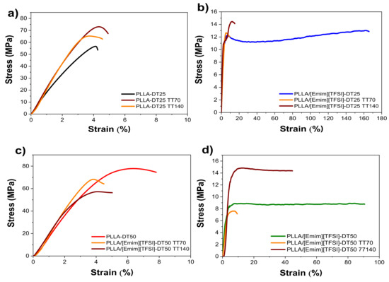 Stress vs. strain curves of PLLA and PLLA/[Emim][TFSI] films dried at 25 °C (a and b) and 50 °C (c and d), for samples subjected to post-thermal treatment at 70 and 140 °C.