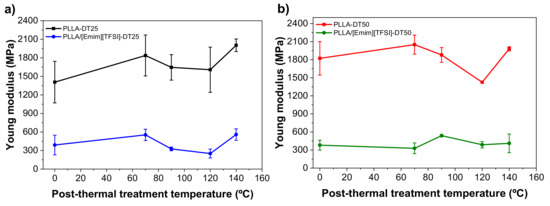 Young modulus as a function of the post-thermal treatment temperature for PLLA and PLLA/[Emim][TFSI] films dried at: (a) 25 °C and (b) 50 °C.