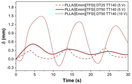 The observed displacements (δ) were measured from the position of the actuator tip upon an applied voltage of 5 Vpp at a frequency of 100 mHz. Figure 9 shows that for an applied voltage of 5 Vpp, the PLLA/[Emim][TFSI]-DT25 film exhibited a maximum displacement ranging from ~0.3 to 0.4 mm. The maximum displacement was observed for the PLLA/[Emim][TFSI]-DT50 composite, with values ranging between 0.2 and 0.5 mm. For these samples, with the increase in the applied voltage from 5 to 10 Vpp, an increase in the displacement to 1.7 mm resulted (Figure 10a), indicating that high voltages favored the ions’ movement within the polymer matrix [19]. The strain developed as a response to the applied electrical field results from the diffusion of the ions and migration to the positive (anions) and negative (cations) electrode layers, and subsequent accumulation close to the electrodes [19,37] (Figure 10b).