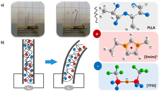 (a) Displacement observed for the PLLA/[Emim][TFSI]-DT25 TT140, upon an applied voltage of 10 Vpp at a frequency of 100 mHz; (b) Schematic representation of the ionic movement caused by an applied voltage.