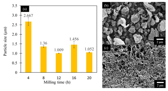 (a) Particle size as a function of wet milling time; scanning electron microscope (SEM) images of hemp particles: (b) after 4 h and (c) after 20 h of wet ball-milling.