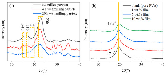 Hemp particles (after 20 h of milling) were added to the PVA solutions at 1%, 5% and 10% weight ratios. Figure 2b shows the XRD patterns of the pure PVA and the hemp/PVA films. The crystallinity (Xc) of the film was also calculated using Equation (2). A representative of the deconvolution of the pure PVA film as an example has been provided in Figure S1. The crystallinity of pure PVA, 1% film, 5% film and 10% film were 21.41%, 23.89%, 23.89% and 42.20% respectively. As shown in Figure 2b, the main diffraction peak of the pure PVA at 19.3° is related to the (101) γ-crystalline phase of PVA [11]. The variation in this peak after loading with 1% and 5% hemp suggests that the hemp particle stabilized the nature of PVA [31]. While adding 10 wt. % of hemp particles, the 2 of the peak for the film shifted from 19.3° to 19.7°, indicating that the structure of pure PVA has been influenced by adding more particles. The peak shifting to a higher degree suggests that the lattice structure of 10% film changed probably due to the compositional impurities in the crystal structure [32] and this might be the reason for higher CrI of the 10% film compared to the 1% and 5% films. In addition, hemp particles showed higher crystallinity (46.96%, Table 1) than PVA film (21.41%) and crystallinity of the composite film was influenced by the amount of hemp particle. Loading PVA film with the higher amount of hemp particles (10%) with high CrI resulted in film with higher CrI compared to the pure PVA film.