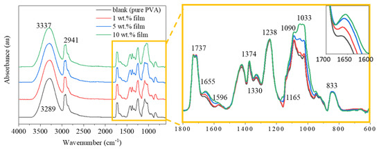 As shown in Figure 5, the absorption peak observed at 3289 cm−1 is attributed to the -OH stretching vibration of inter- and intra-molecular hydrogen bonds [15,33]. With increasing the amount of hemp powder, the peak at 3289 cm−1 shifted to a higher wavenumber of 3337 cm−1. This might be due to the formation of hydrogen bonds in the composite film and the higher amount of hemp means more hydrogen bonds between hemp and PVA. The –OH groups of the lignin are capable of forming hydrogen bonds with the PVA polymer matrix [34]. The infrared spectra at 2941 cm−1, 1238 cm−1 and 833 cm−1 are the typical peaks of C-H [35] from cellulose, hemicellulose and lignin. The peak at 1737 cm−1 represents the –C=O bonds in xylan from hemicellulose [36]. The peak at 1655 cm−1 and 1596 cm−1 are the vibrations of the –C=O in quinone or p-quinone and C=C in the aromatic structure which only exist in lignin, indicating that lignin has been persevered in hemp particle. The peak at 1374 cm−1 represented symmetric and asymmetric bending of CH3 groups, which were from cellulose and lignin. The peak at 1330 cm−1 resulted from the –C–O stretching of the syringyl ring from lignin. The band at 1033 cm−1, 1090 cm−1 and 1165 cm−1 is due to C-O stretching [33] which is assigned as cellulose and hemicellulose.