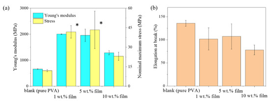 Mechanical properties of pure PVA and hemp/PVA composite films: (a) Young’s modulus and nominal maximum stress (b) Elongation at break (%). * denotes significant difference (p ≤ 0.05) was found between data.