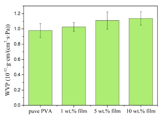 Figure 7 shows the effect of hemp content on the water vapor permeability of hemp/PVA composites. The film made from pure PVA exhibits a low water vapor permeability of 0.98 × 10−12 g·cm/(cm2·s·Pa). When the amount of hemp reached 10%, the WVP of the composite films reached a maximum of 1.14 × 10−12 g·cm/(cm2·s·Pa). The films became soft due to the water absorption [39] and this absorption may have an influence in the hydrogen bonding between hemp and PVA [40]. However, the differences between WVP of the composite films were not found to be significant (p > 0.05). The WVP value of the commercial packaging plastic film made of HDPE (High-density polyethylene) at 37.8 °C and 90% RH has been reported to be 1.741–3.482 × 10−12 g·cm/(cm2·s·Pa) [41]. This indicates the fabricated hemp/PVA composite film in this study has a strong potential for food packaging applications.